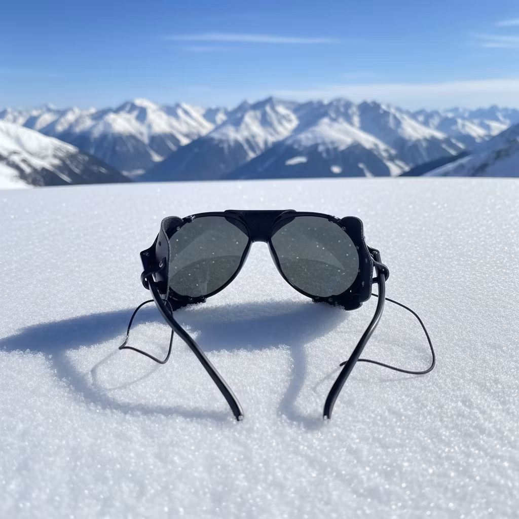 Klassiska retro glaciär solglasögon med polariserande linser för stark solljus som stänger ute störande och skadligt sidoljus med sina konstläder skydd på sidorna. Självklart med ett tunt senilsnöre. ,