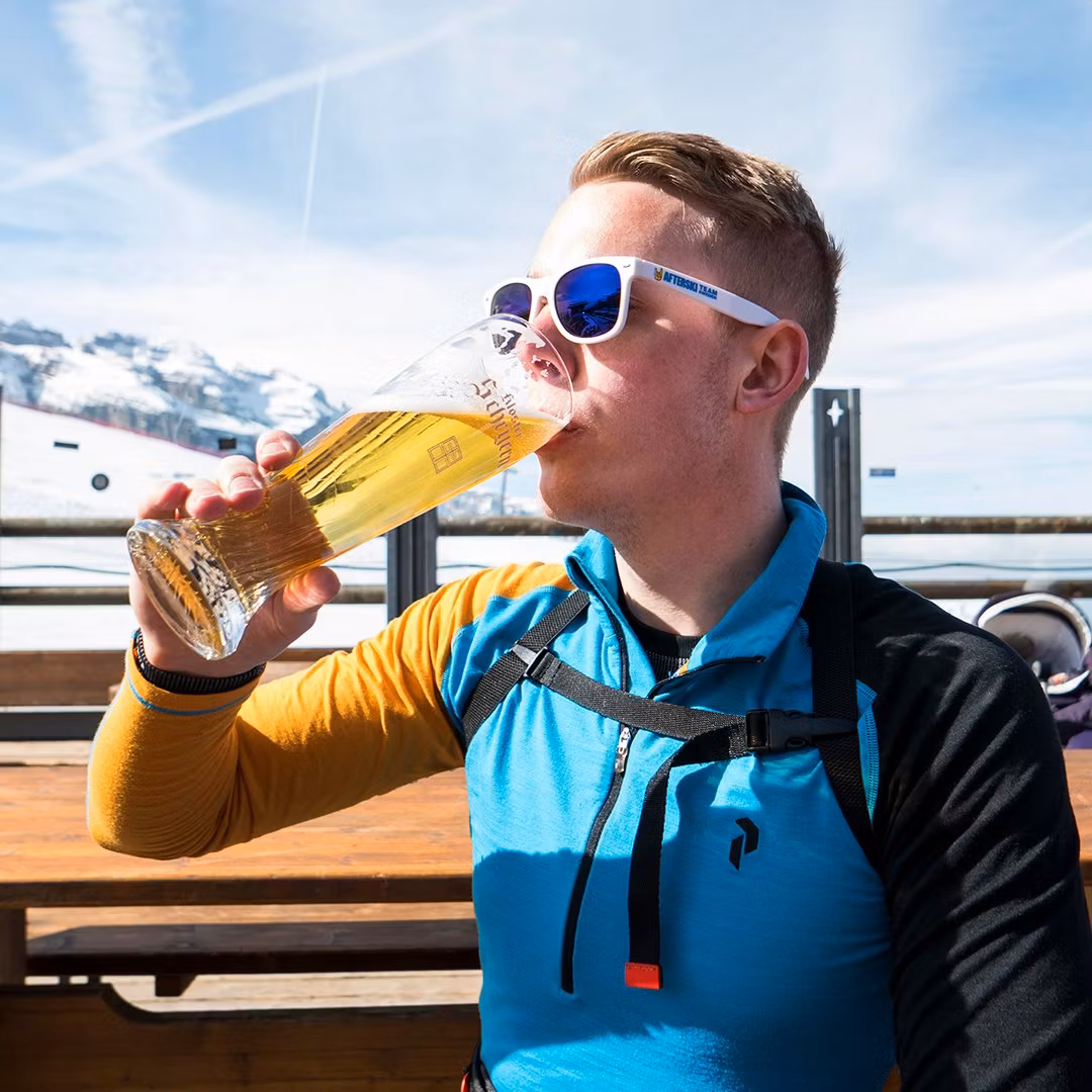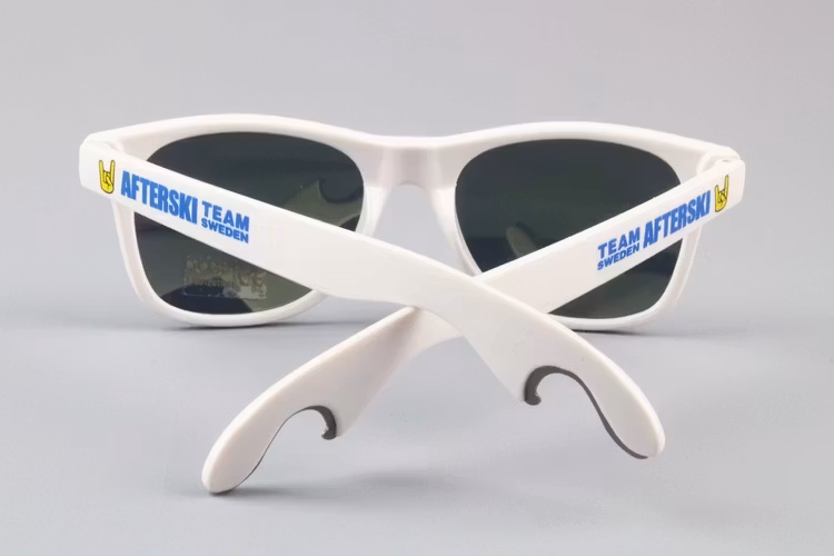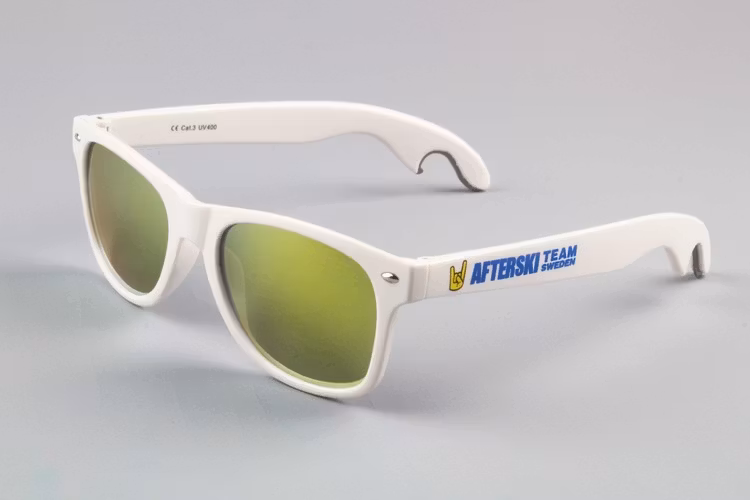 Snygga solglasögon i klassisk Wayfarer-modell med unik ölöppnare. Eller tvärtom kanske... Öppnare med inbyggda solglasögon. Helt genialt iallafall. Afterski Team Sweden logo på sidorna. Levereras i putsdukspåse.