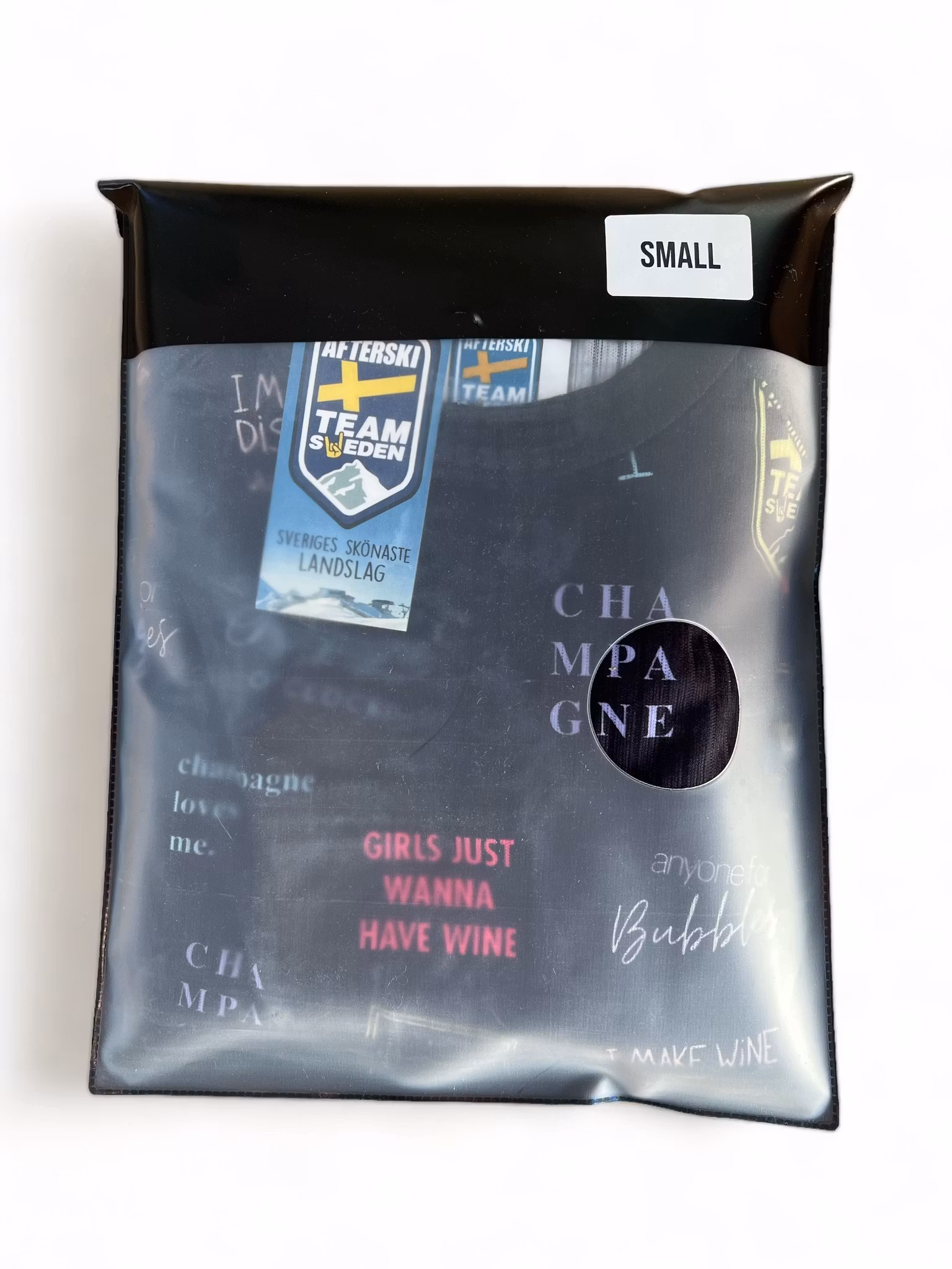 Kvinna och vinälskare? Då är Vinstället ditt nya favoritunderställ. Svart botten med snyggt mönster av färgglada och härliga texter om varför vin / bubbel är så gott.